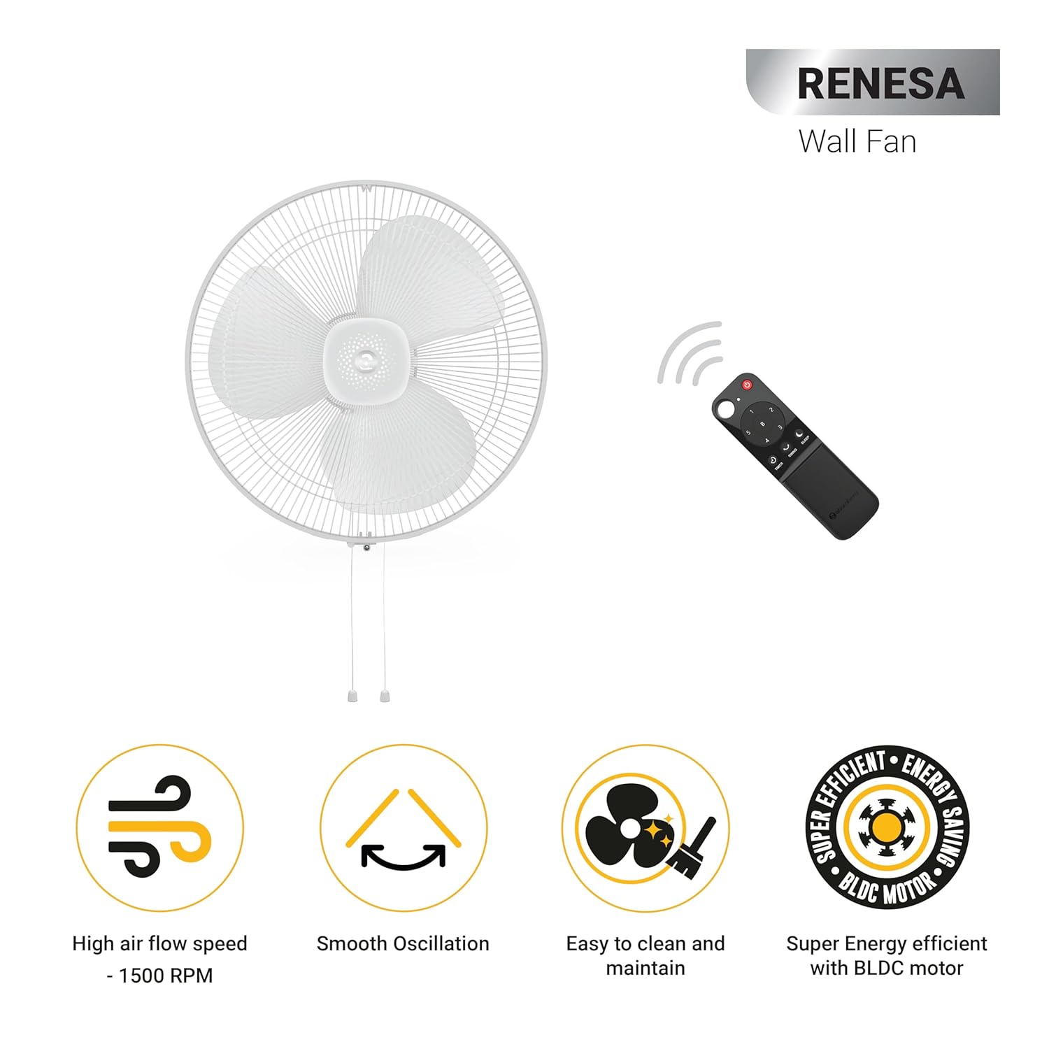 The Atomberg Renesa wall fan is a high-performance and energy-efficient choice for your space. Powered by BLDC motor technology, it delivers a powerful airflow of 76 CMM at a top speed of 1500 RPM while consuming only 35W, resulting in significant energy savings of up to 65%.