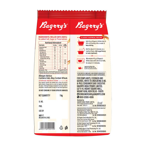 Premium Quality, Non GMO and Minimally Processed Oats: Experience the epitome of quality with Bagrrys White Oats – carefully selected, expertly processed, Non GMO and consistently delivering a premium blend of taste and health benefits for a truly elevated breakfast.