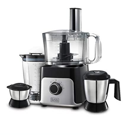 BLACK+DECKER Mixer + Food Processor 11 in 1 Convenience & Versatility Bowl: 2 L Multiple food processing bowl for kneading Jars: 1.8 L Jar for Blending, 1 L SS Jar for Wet Grinding, 0.5 L SS Jar for Dry Grinding. Stainless Steel Blades: 5 Stainless Steel blades for fine & coarse chopping, slicing & shredding