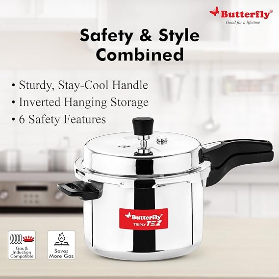 20% Faster Cooking, Ergonomically designed body Premium quality Triply material Aesthetically designed easy grip stay cool handle Uni-direction rotation for easy locking Inverted hanging for less storage space