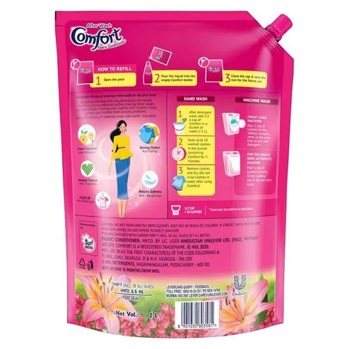 COMFORT FABRIC CONDITIONER: Detergents can often tangle fibres in your clothes, making them appear rough, dull, and lifeless. Our After Wash Liquid Comfort Fabric Conditioner adds shine and softness back into your clothes, even after repeated washing.