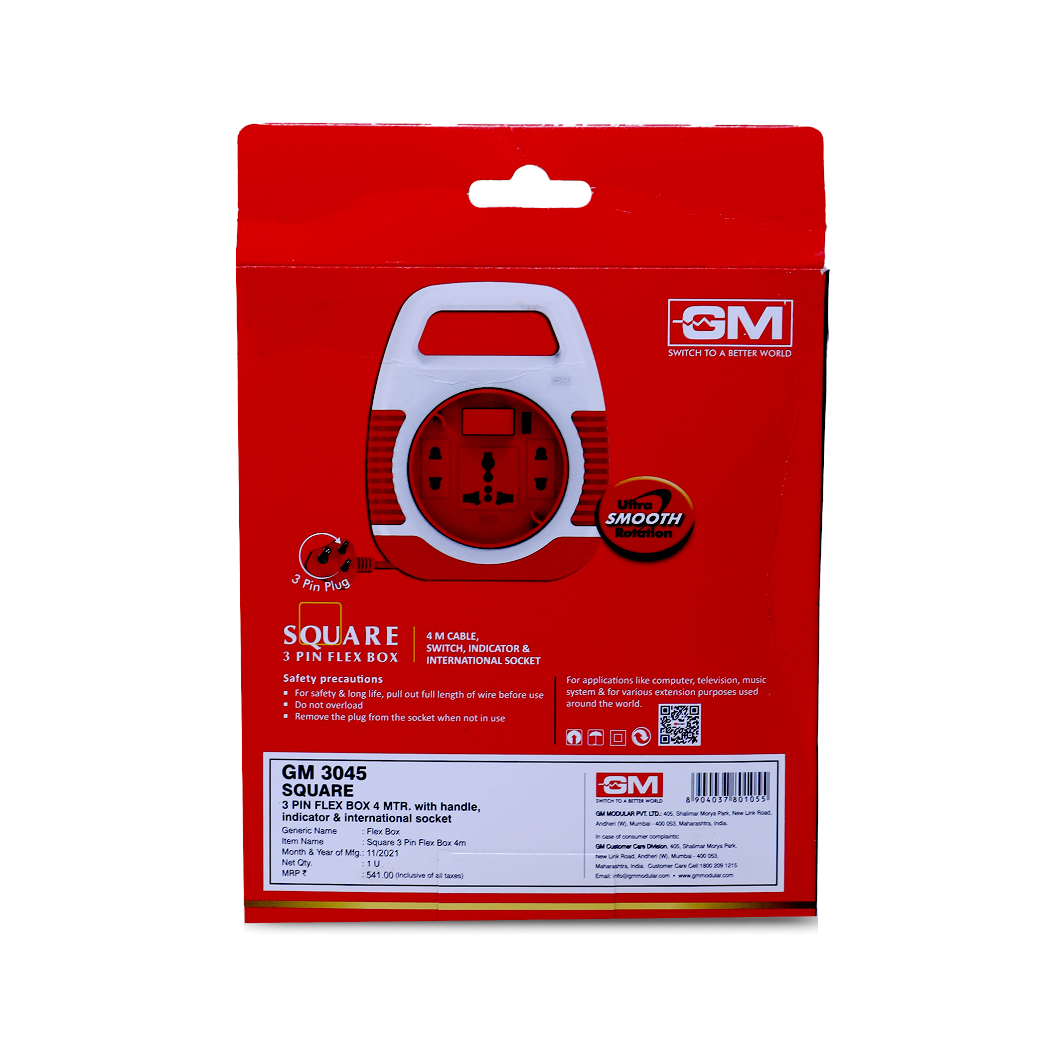 GM Square 3 Pin Flex Box 3045 – 4 Meter Cable ,Switch ,Indicator and International Socket