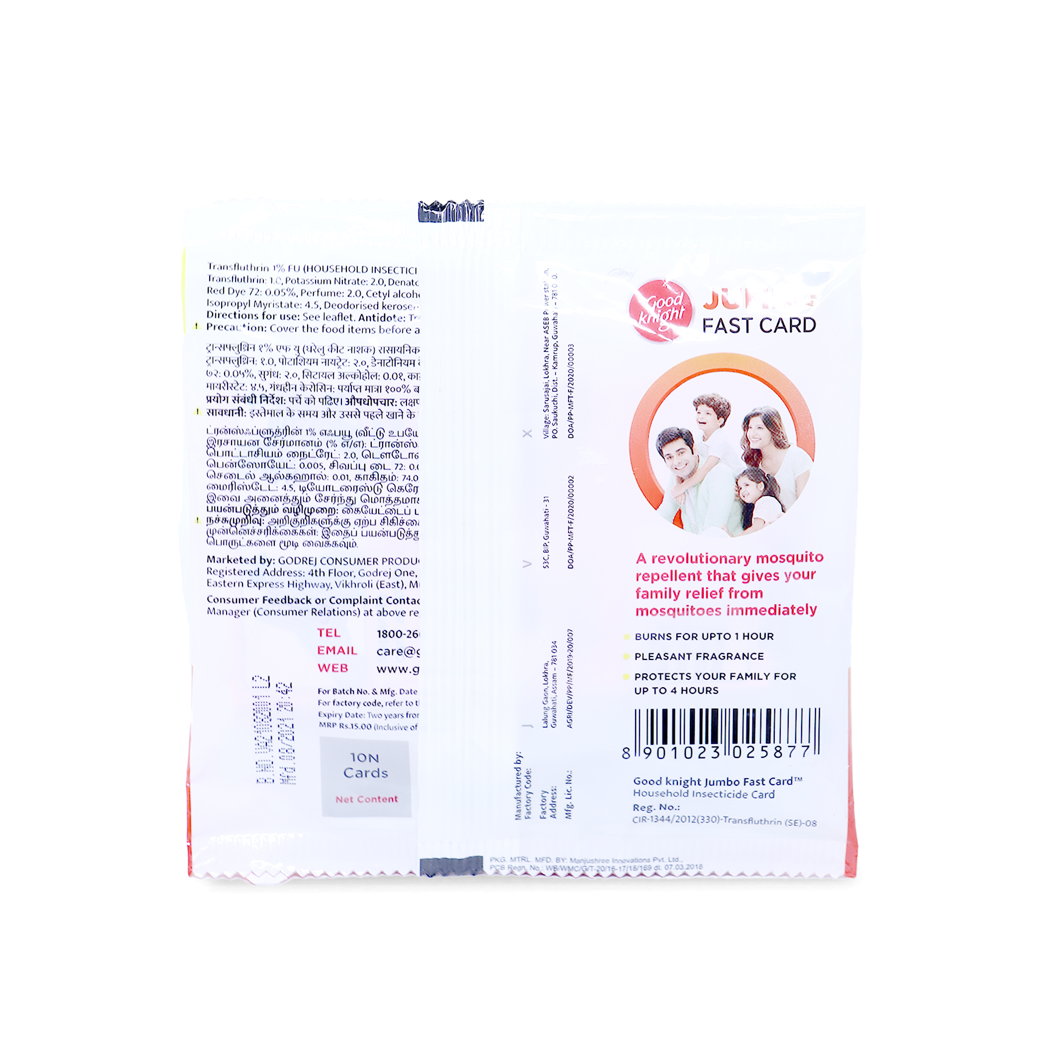 Good Knight Fast Card Jumbo (10 Nos) provides up to 4 hours of powerful mosquito protection. Easy to use, just place it in any room for instant relief from pesky insects. Enjoy a peaceful, bite-free environment for you and your family perfect for home or travel.