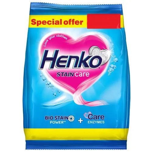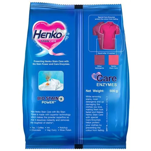 Henko Stain Care has Bio Stain Power which ensures even the most tough & hard to remove stains like Tea/Coffee, Curry, Oil, Ketchup, Ink etc. are removed with ease.