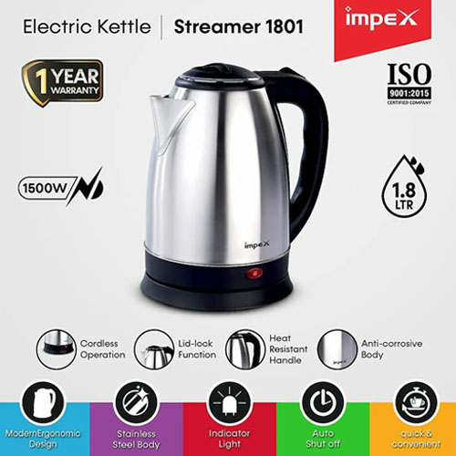 IMPEX Electric Kettle Steamer 1801 (1.8L) offers fast boiling and versatile steaming. With a large 1.8L capacity, it heats water quickly and steams food efficiently. Its sleek design and safety features make it a perfect addition to any kitchen.