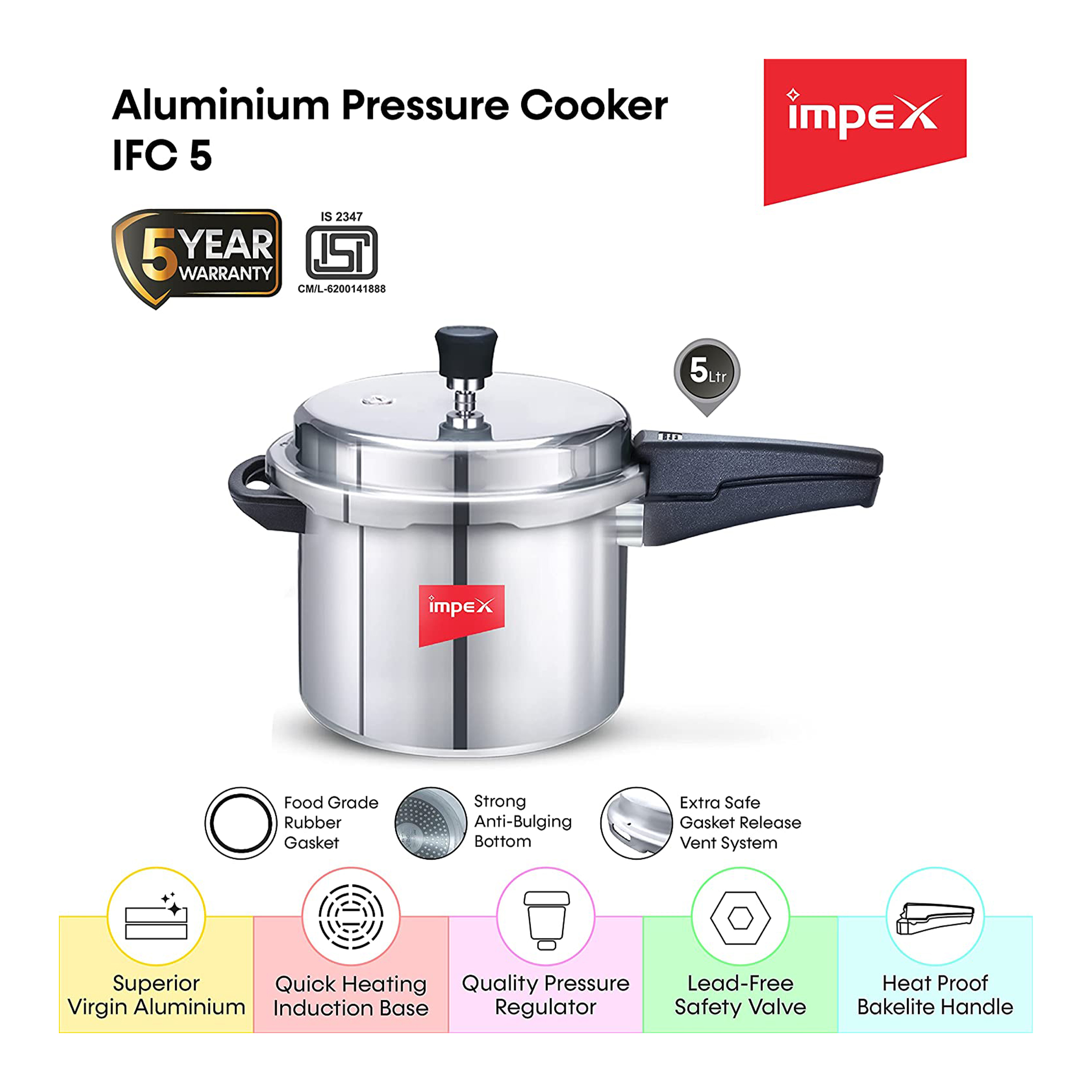 A reliable 5-liter pressure cooker made of aluminum, designed for efficient cooking.