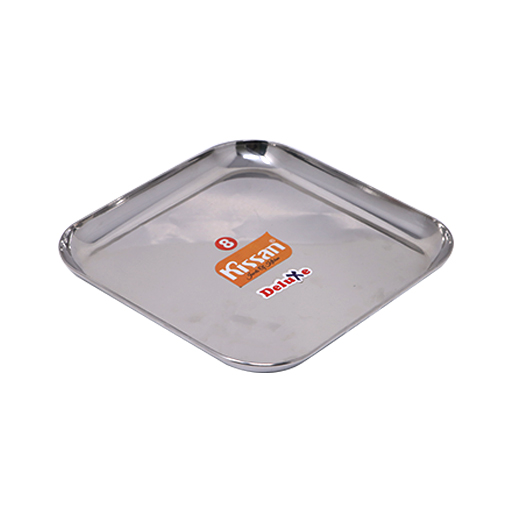 A square china plate made of stainless steel, perfect for serving and presenting dishes.