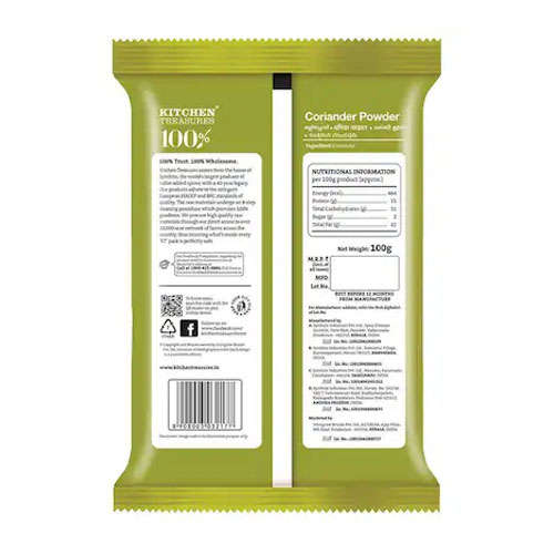 Enhance your dishes with Kitchen Treasures Coriander Powder. This 100 gm pack offers rich flavor and aroma, perfect for curries, marinades, and spice blends. Made from high-quality coriander seeds, it adds a delightful taste to your cooking. Stock up for delicious meals.