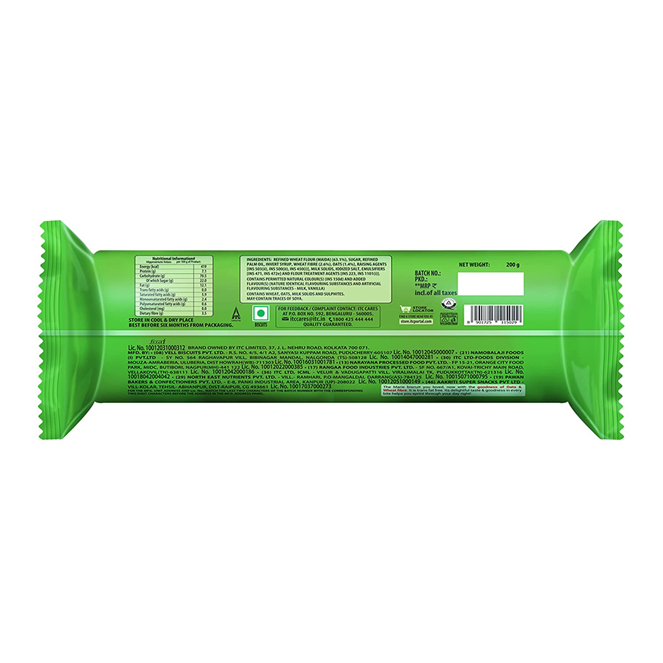 Sunfeast Marie Light Oats Fibre Biscuit No artificial flavours, Contains Permitted natural Colors and added flavours, No cholesterol