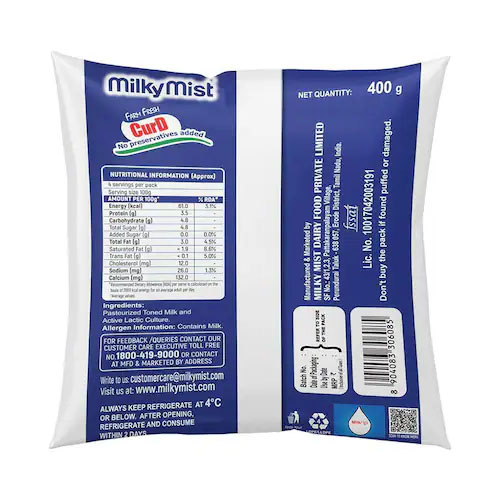 Milky Mist offers Pouch Curd which consists of 3.0% Fat and widely used Indian cusines.