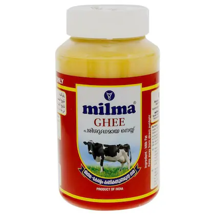 Milma Ghee 500 ml is a clarified butter product offered in a 500 ml container, commonly used for cooking and flavoring in Indian cuisine.