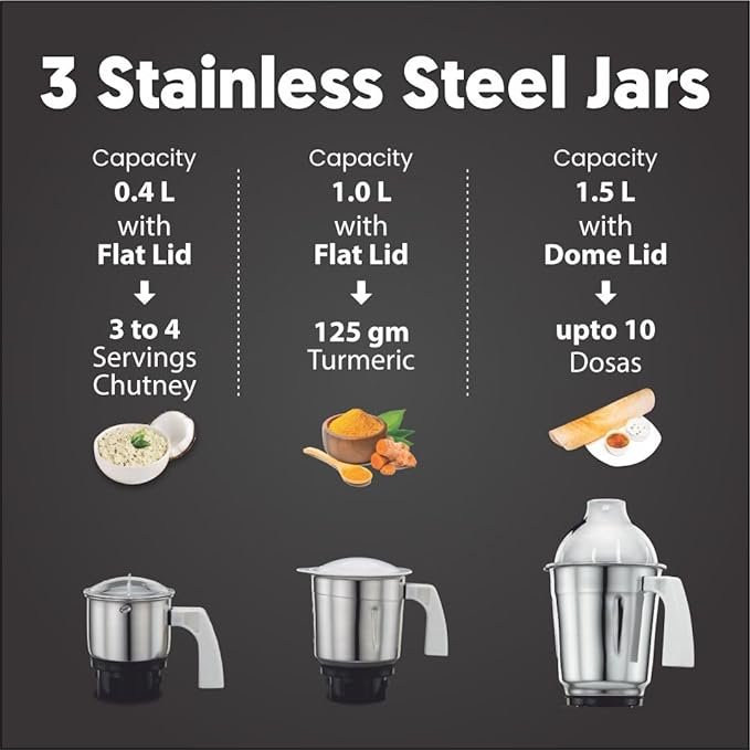 1% stainless steel jars Unbreakable polycarbonate domes and lids Life long free service Sturdy ergonomically designed clamped handles Heat sensitive cutoff for protection against voltage fluctuation and overload