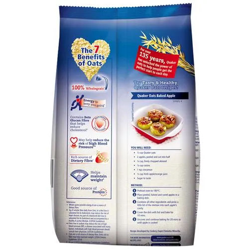 Quaker oats are made from 100% whole grain oats, a natural carbohydrate, protein, and dietary fibre source. It helps reduce the risk of high blood pressure and cholesterol.